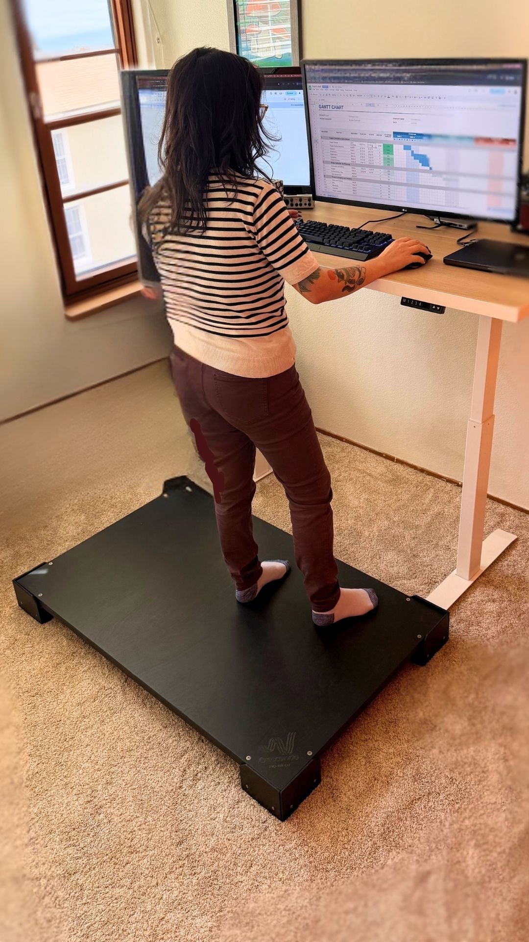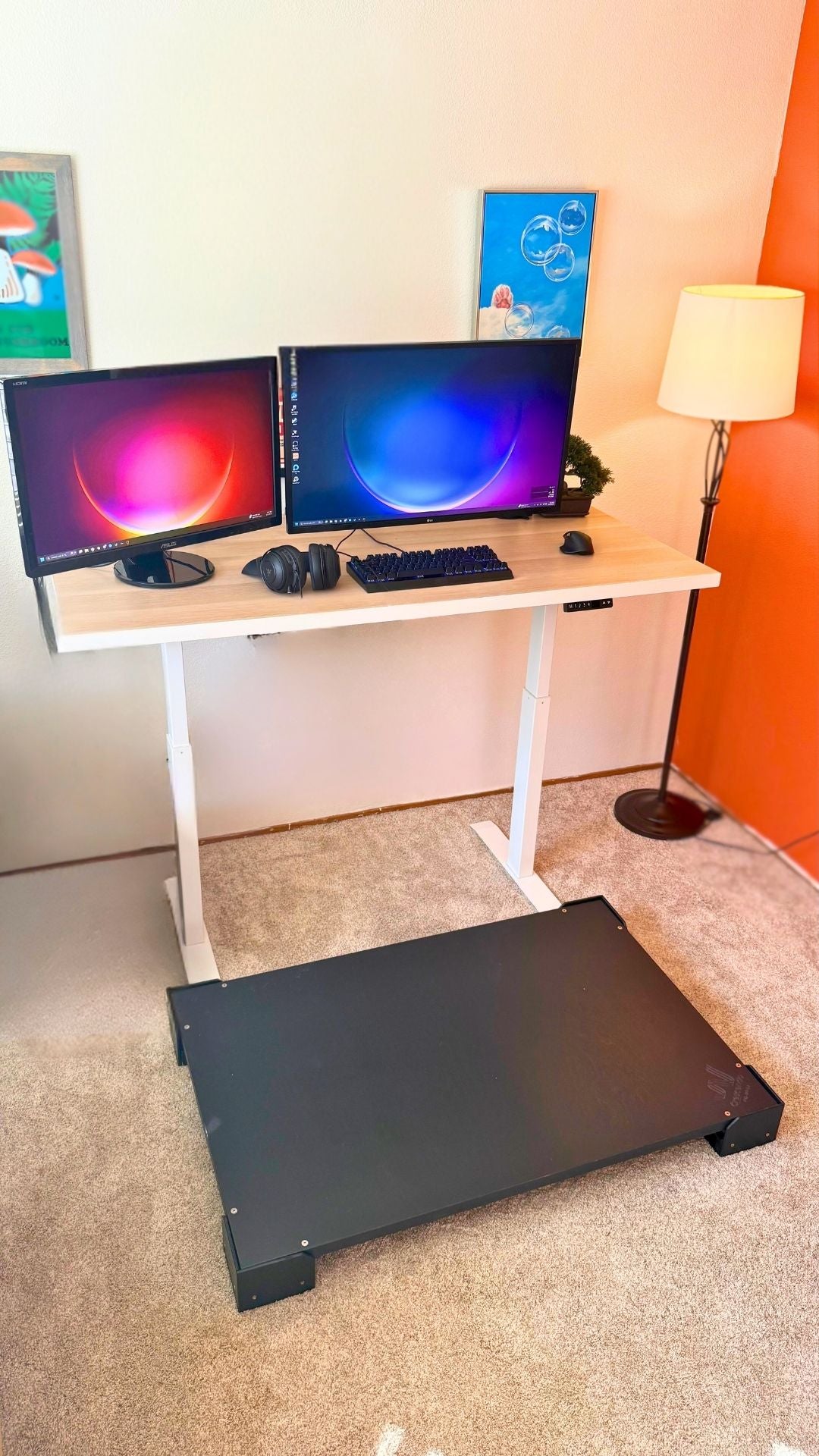 Its compact footprint is made to fit naturally under desks and tables, giving producers and creators a new way to connect with their work. Stand on it while you mix, edit, and explore.